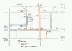 山屋への進級経路は、非常にわかりづらくて申し訳ございませんが、画像の青のラインを通ってお越しくださいませ。